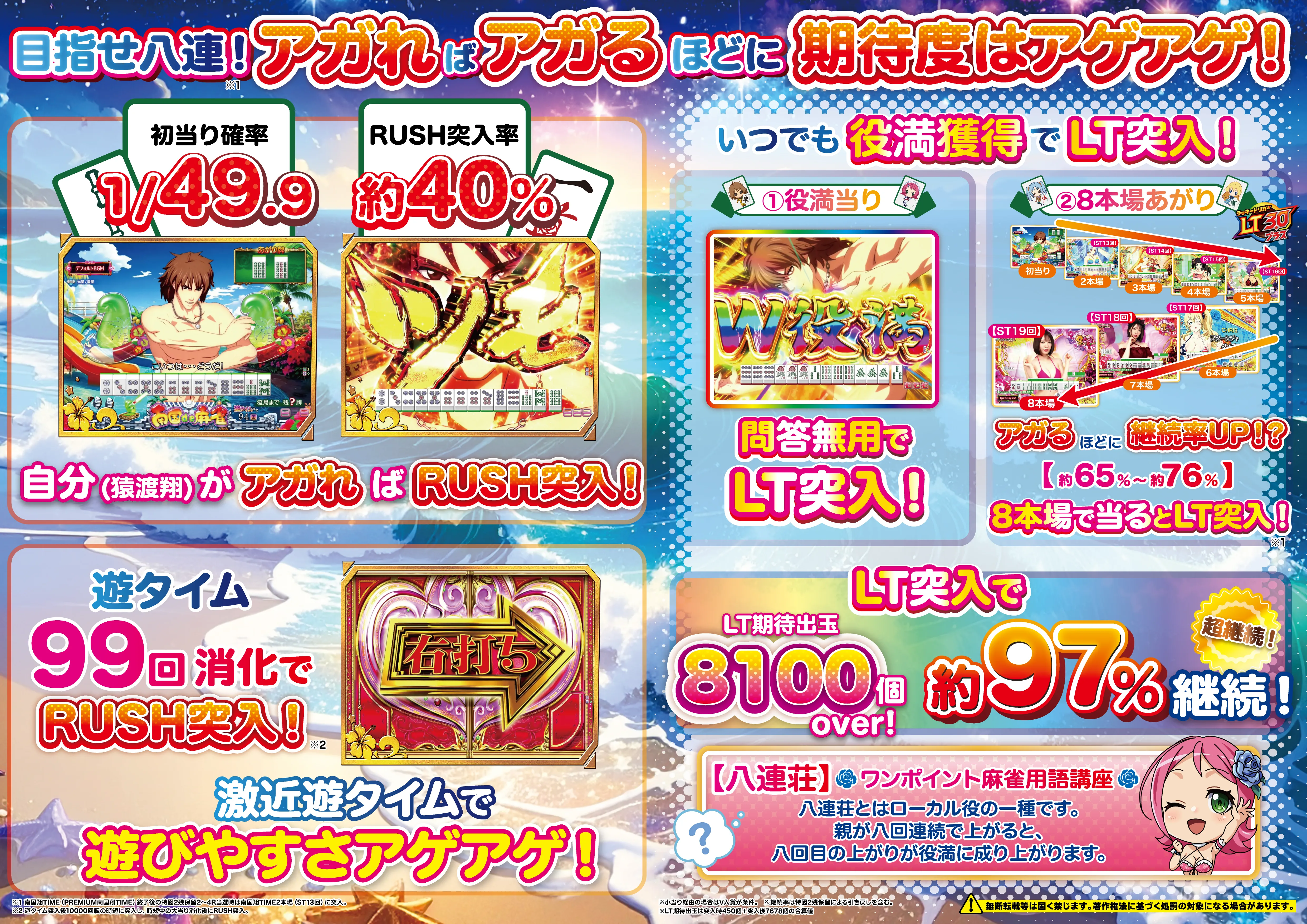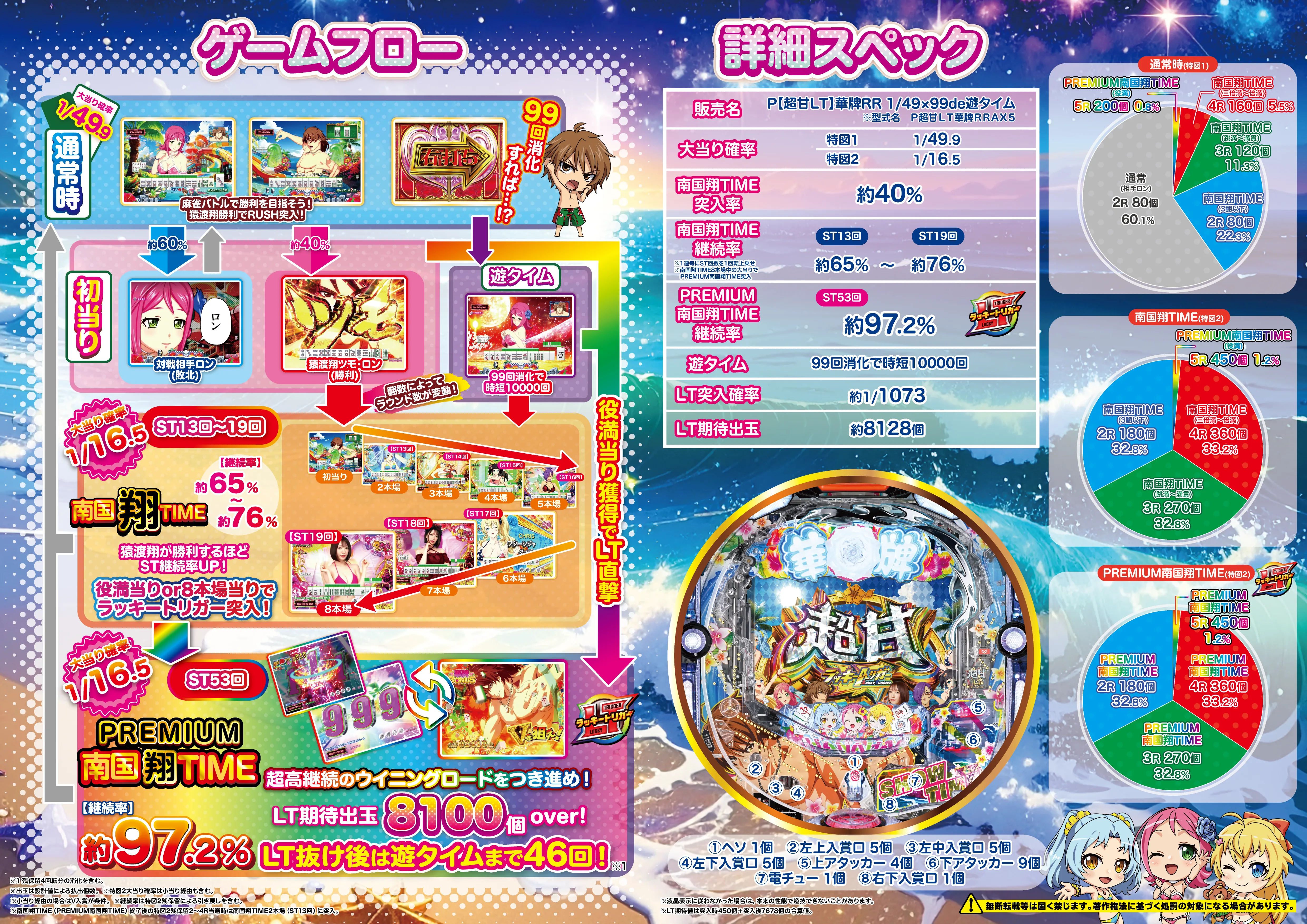 約65%~約76% ※継続率は特図2残保留による引き戻しを含む ※1連毎にST回数を 1回転上乗せ ※南国翔TIME8本場中の大当りでPREMIUM南国翔TIME突入 ※南国翔TIME(PREMIUM南国翔TIME)終了後の特図2残保留2~4R当選時は南国翔TIME2本場(ST13回) に突入 |